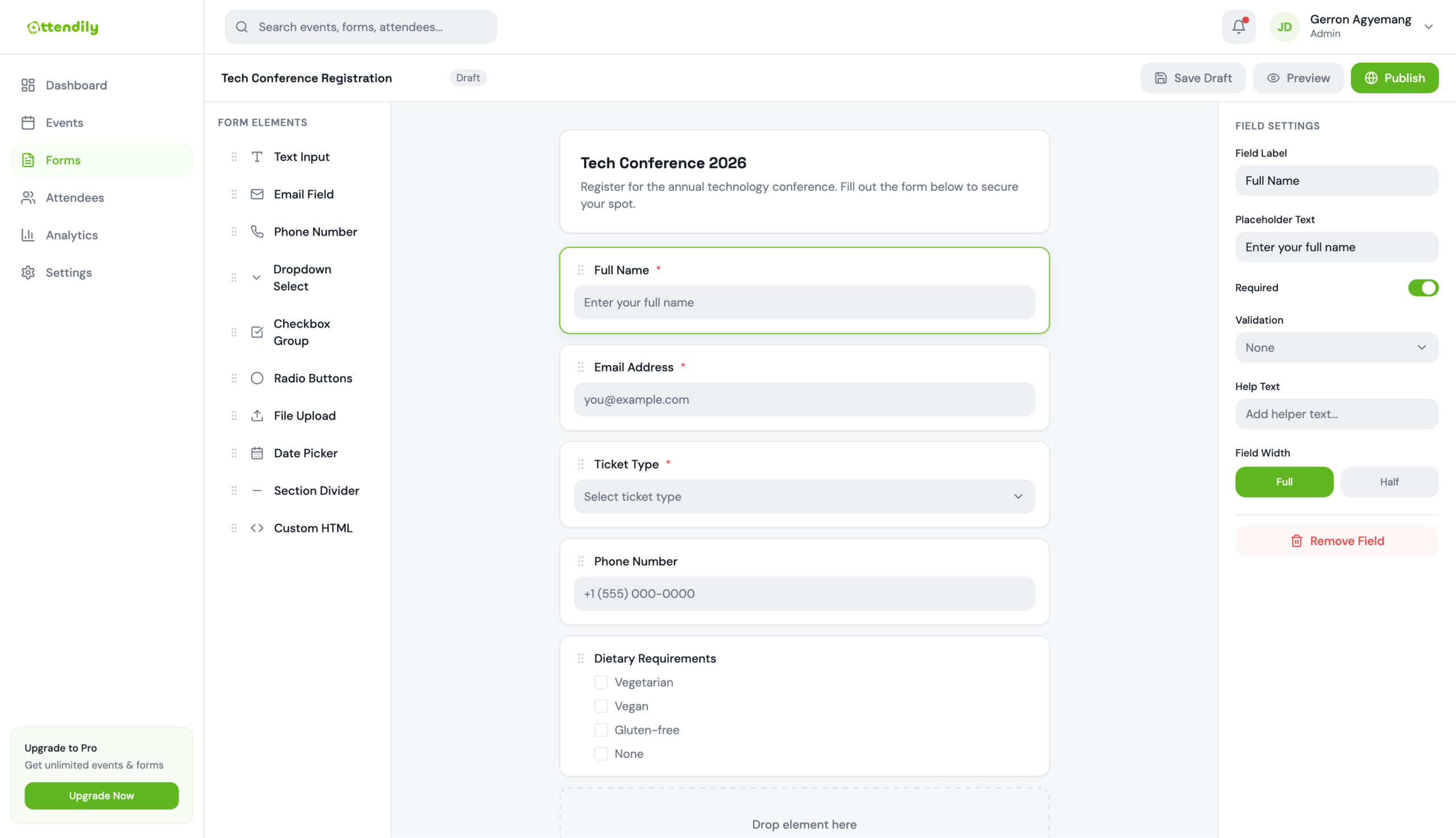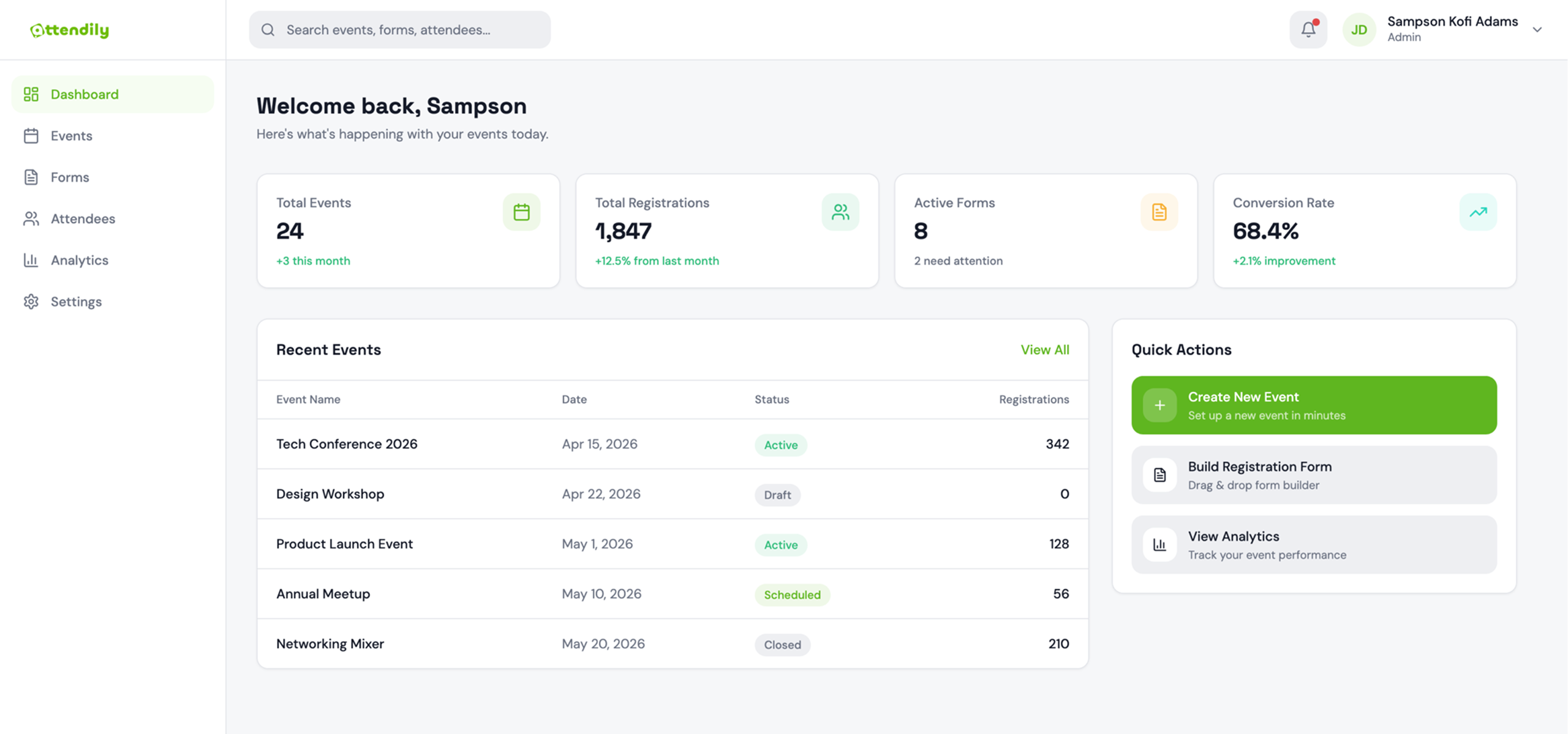 From building custom registration forms to tracking attendance and generating reports, Attendily provides all the tools you need to plan, manage, and execute events seamlessly, all in one place.